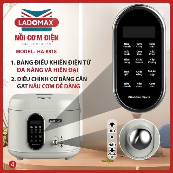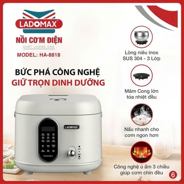 - Chức năng: Nấu nhanh, Cơm cháy, Cơm dẻo, Nấu canh, Cơm khô, Nấu cháo, Hâm nóng, Cháo trẻ em, Hấp chưng và Giữ ấm.