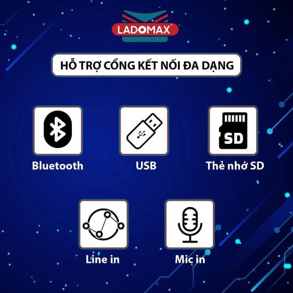 - Kết nối: Bluetooth, USB, Laptop, Smartphone, SD, Remote, 1x Micro, 1x Ghita, FM.