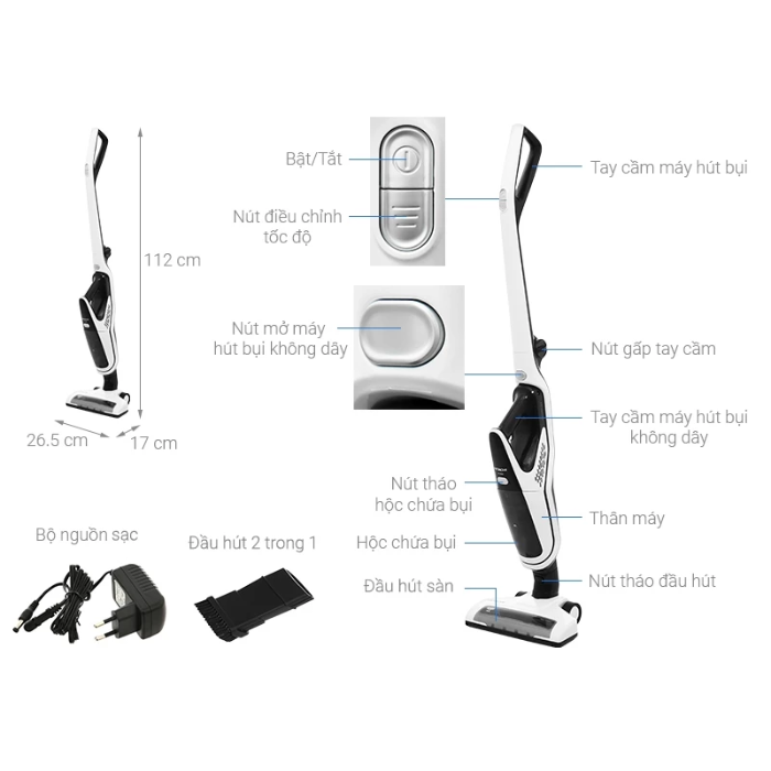 - Chổi quét 2 trong 1 (chổi hút bụi, đầu hút khe)