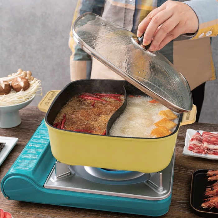 - Thiết kế hai ngăn thông minh: Cho phép nấu hai loại nước lẩu khác nhau cùng lúc, hoặc linh hoạt sử dụng để chiên, rán, nướng.