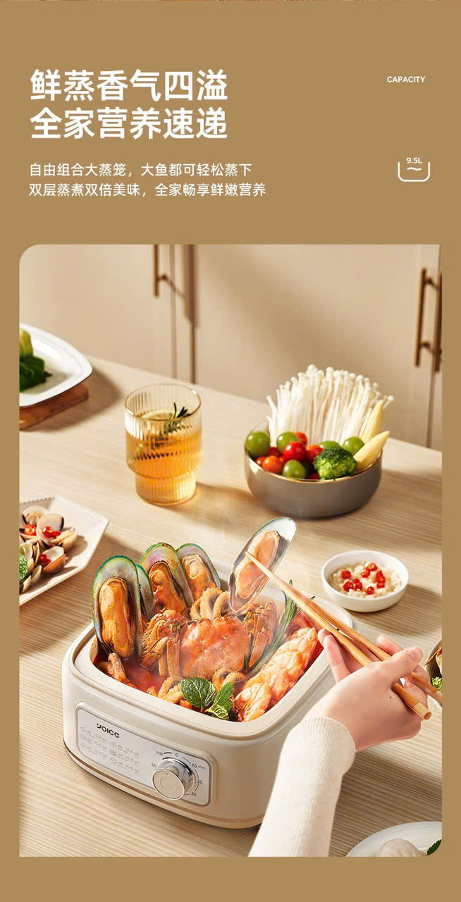Dung tích lớn 9.5L: Thiết kế 2 tầng rộng rãi cho phép chuẩn bị bữa ăn cho cả gia đình từ 4-6 người hoặc phục vụ các bữa tiệc nhỏ tại gia.