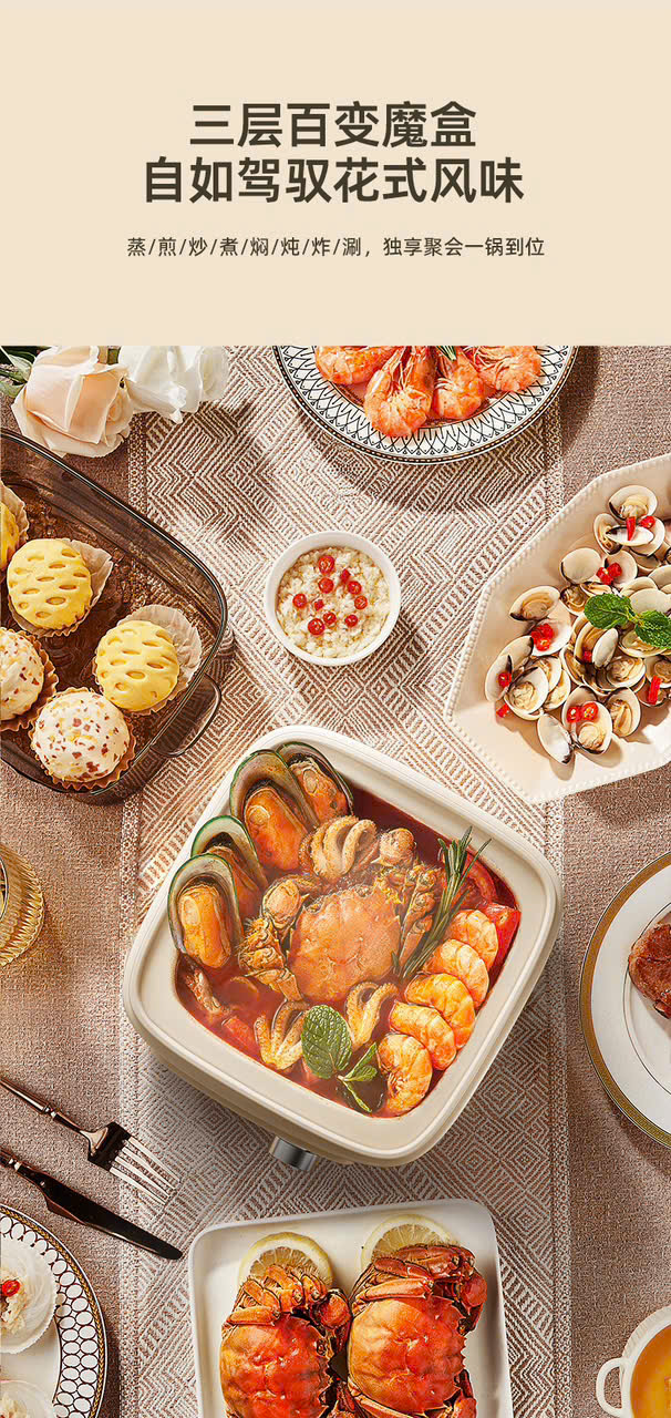 Đa năng "6 trong 1": Tích hợp đầy đủ các chức năng: Hấp, Xào, Luộc, Hầm, Chiên và ăn Lẩu. Bạn có thể vừa nấu lẩu ở dưới, vừa hấp hải sản ở trên vô cùng tiện lợi.